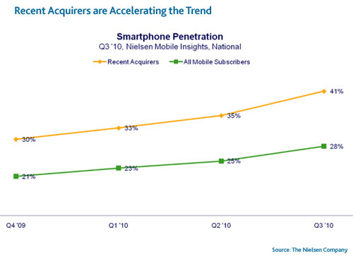 According to the most recent numbers from Nielsen, 28% of US cellphones is a smartphone. Amongst those consumer that bought a new phone over the past six months, 41% chose a smartphone, up 35% compared to Q2.