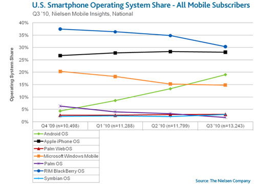 In the US, BlackBerry remains the most popular OS, followed closely by Appleās iOS. Android keeps climbing and ranks third, beating Windows Mobile. Windows Phone 7 is not in the list as the devices had not reached the market yet.