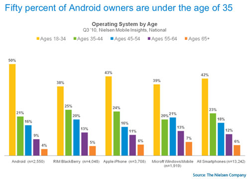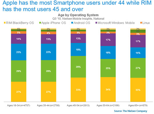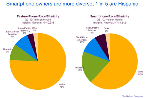 Apple has most consumers under 44 while 50% of Android owners are under 35. Nielsen also broke down the ethnic diversity of smartphone owners.