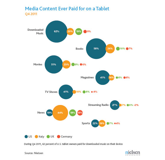 In the US, most tablets owners have, at some point, paid for music (62%) on their devices. Runners-up are books (58%) and movies (51%). In Europe, news is the most popular type of content with 44% of the owners paying up for it in Italy, 19% in the UK and 15% in Germany. Italy happens to be the country most willing to spend money on content.