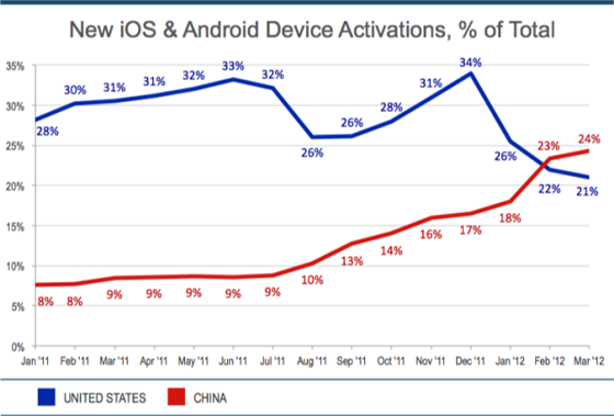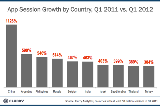 Early 2011, China ranked 10th when it came to registered app sessions. This year, the country already ranked second and next year… probably first as the county now activates the most iOS and Android devices.