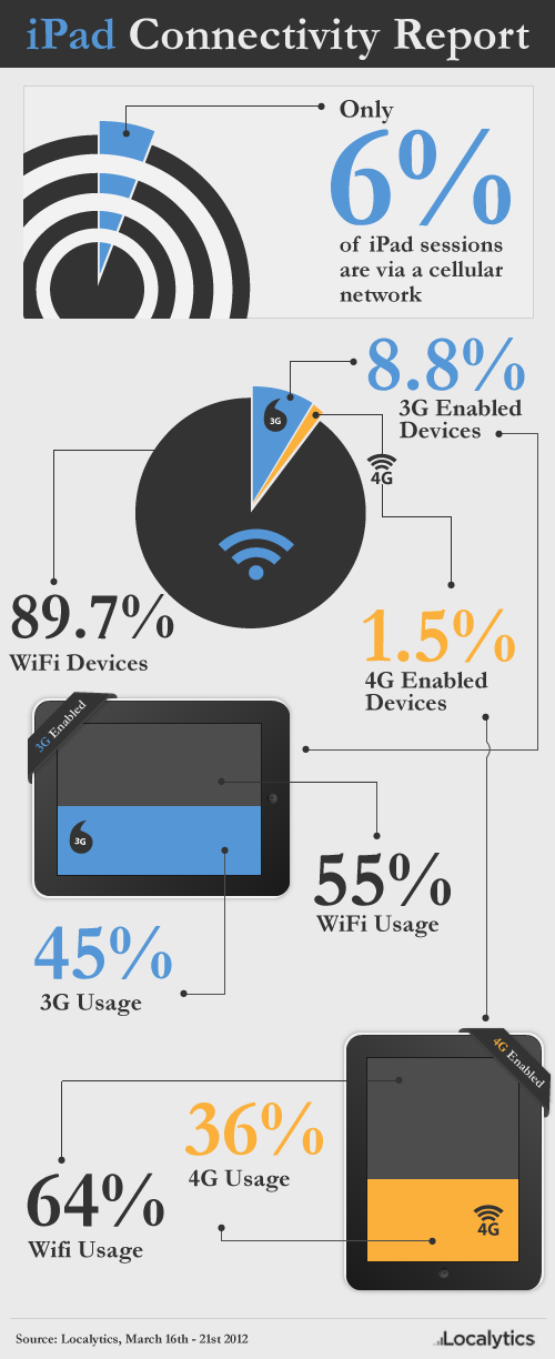 Though our findings are far from representative, it is very interesting to check out Localytics’ latest infograph detailing that only 6% of app sessions happen over a wireless network. Their report also shows that 89.7% of the iPad’s on the market only support WiFi.