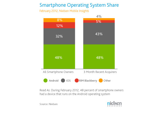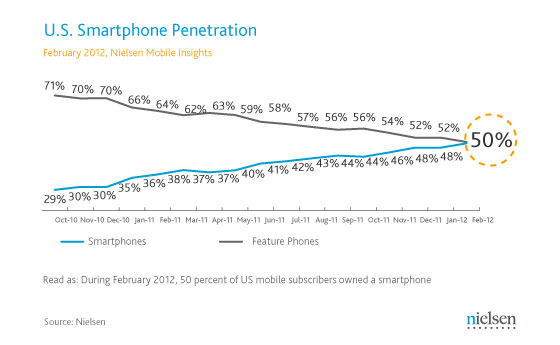 As of February, Nielsen reports that nearly half of the US residents with a mobile contract own a smartphone. In February 2011, the percentage of smartphone owners was just 36%.