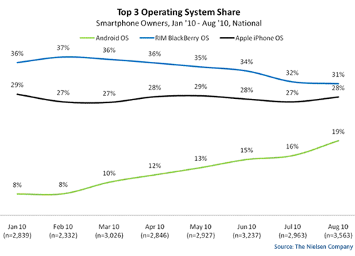 Looking at actual marketshare, Android is growing, but BlackBerry remains the leading OS at 31%. Apple owns 28% of the market while Android is at 19%. Looking at the graph, it will take three to six months before Android will overtake the competition.