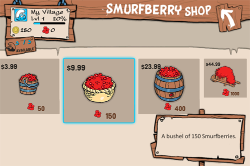 What is interesting to note is that the currency in the Smurfberry shop is not even adapting to the local currency. We took the screenshot above from a Dutch iTunes account. Another sign kids might think it is not about real money.